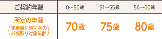 健康還付給付金のお受け取り年齢:ご契約年齢30・40・50歳の場合は70歳、