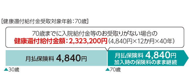 所定の年齢までにお払い込みいただいた保険料※1は、「健康還付給付金」※2もしくは、「入院給付金等」としてお受け取りいただくことができます。お受け取りいただいた入院給付金等の合計額がお払い込みいただいた保険料を超えた場合、健康還付給付金のお受け取りはありません。